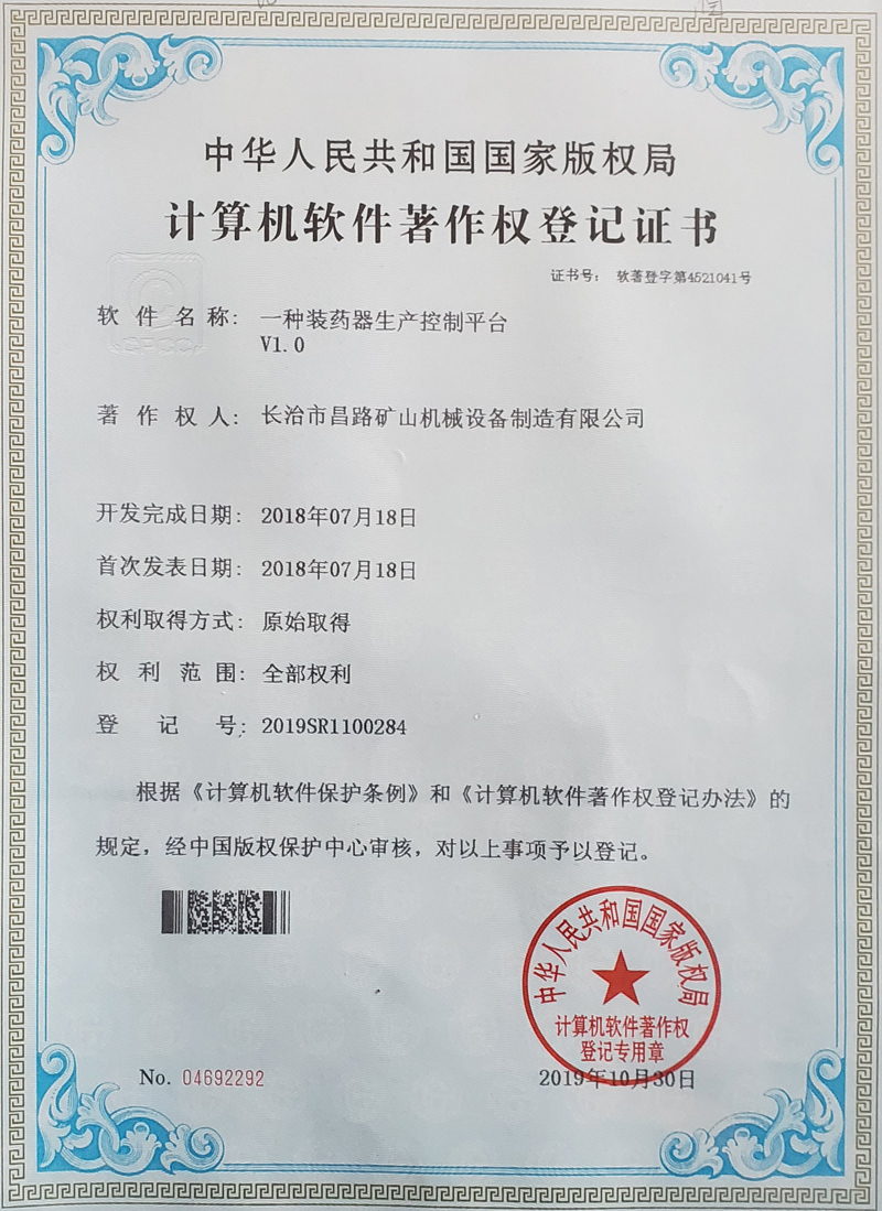 榮獲裝藥器生產(chǎn)控制平臺著作權(quán)登記證書